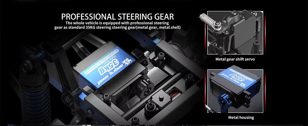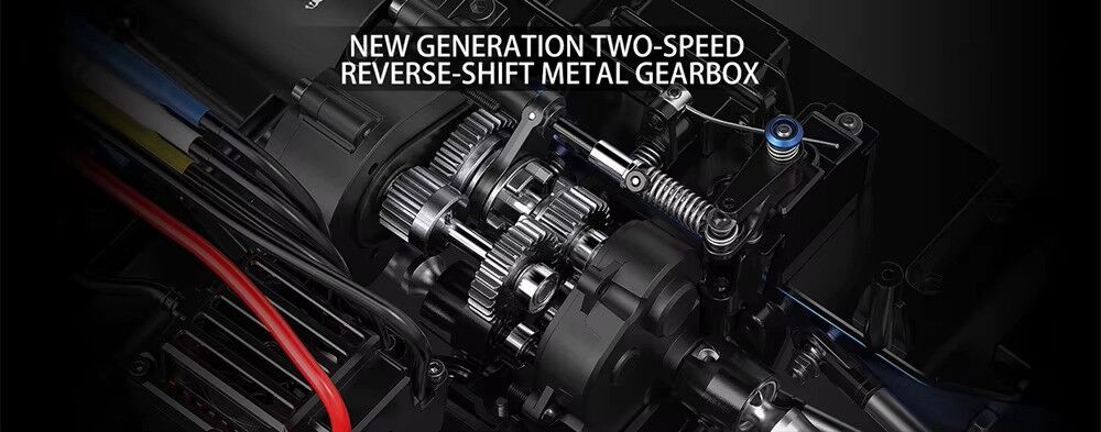 - Gearing: 2-speed gearbox with remote-controlled 17g metal gear servo shift